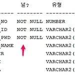 제약조건 사용자가 원하는 조건의 데이터만 유지하기 위해서 특정 컬럼에 설정하는 제약 데이터 무결성을 지키기 위해 제한된 조건이다. NOT NULL = 데이터에 NULL을 허용하지 않음 테이블 생성 시 속성 뒤에 이어서 붙혀줌 사용 법 CREATE TABLE [옵션들]( NOT NULL, ); NOT NULL 예시 CREATE TABLE USER_NOTNULL( USER_NO NUMBER NOT NULL, USER_ID VARCHAR2(20) NOT NULL, USER_PWD VARCHAR2(30) NOT NULL, USER_NAME VARCHAR2(30), GENDER VARCHAR2(10), PHONE VARCHAR2(30), EMAIL VARCHAR(50) ) 데이터 삽입 : 정상 삽입 INSERT ..